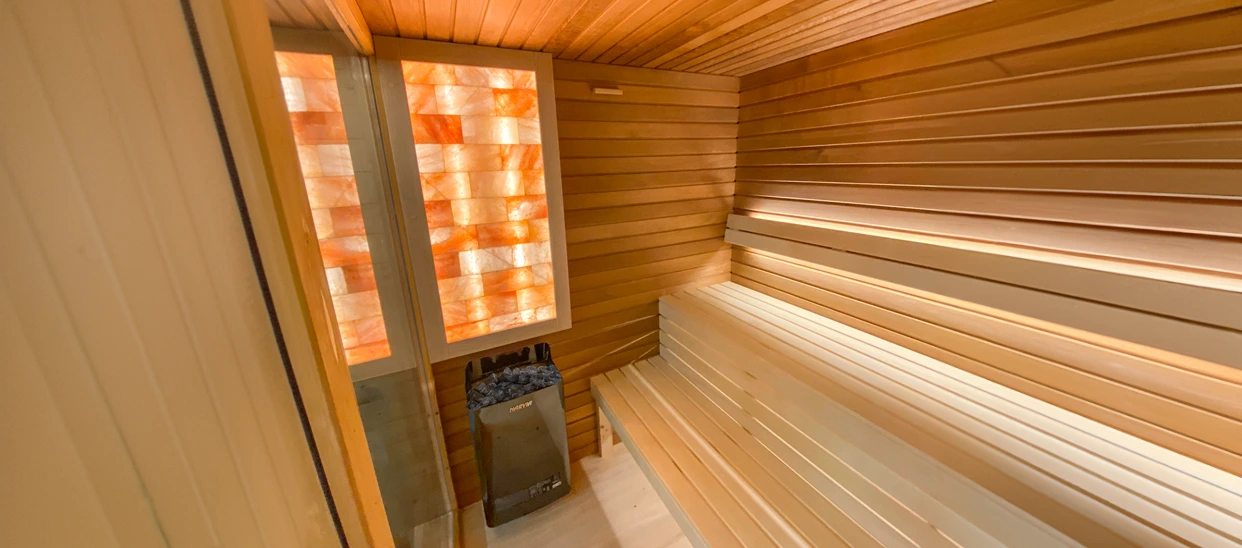 - Ciepłe ledowe światło z możliwością regulacji intensywności wewnątrz sauny